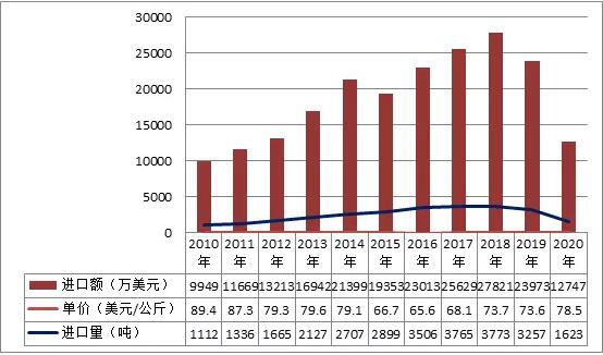 根據(jù)我國(guó)海關(guān)總署公布的數(shù)據(jù)顯現(xiàn),2020年我國(guó)共進(jìn)口光纖用高純石英管1622.941噸,進(jìn)口額1.275億美元,與2019年同期相比進(jìn)口量、進(jìn)口額減少了一半。進(jìn)口價(jià)格約78.5美元/公斤,較2019年提高了6.7%。