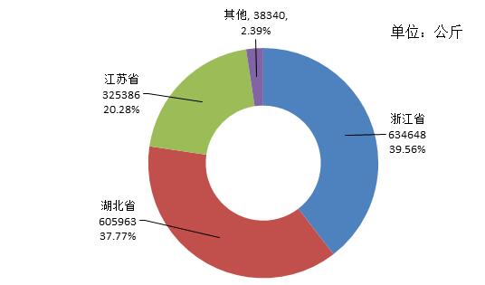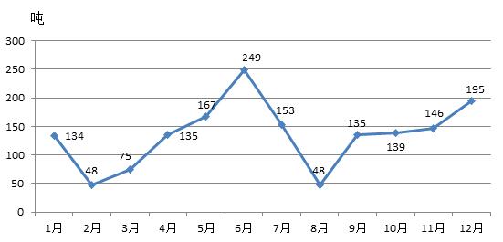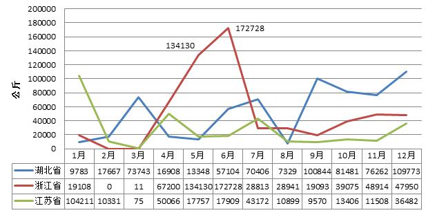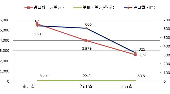 由圖6可以看出,湖北省和江蘇省月度進(jìn)口量相對(duì)比較均衡,而浙江省則集中在5月和6月,共進(jìn)口了307噸石英管,逾越全省全年進(jìn)口總量的一半,遠(yuǎn)遠(yuǎn)高于其他月份。