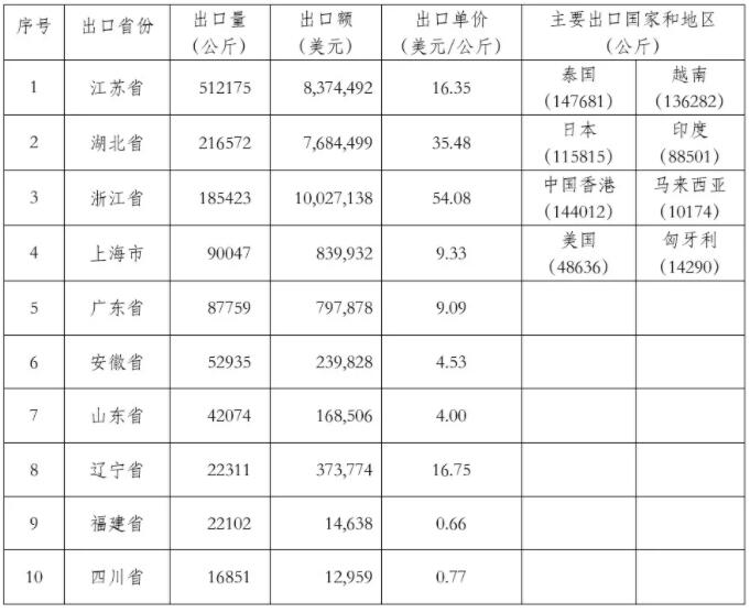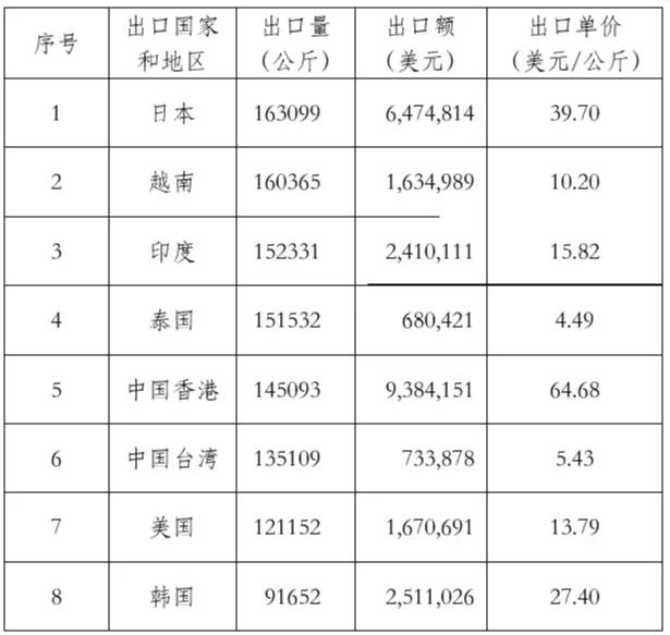 在出口國(guó)家和地區(qū)中,我國(guó)出口到日本的量最大,為163.099噸,出口額647萬(wàn)美元。到越南的出口量與日本的出口量非常接近。各出口國(guó)家和地區(qū)的狀況如表1所示。