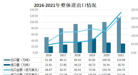 從全體上看,近兩年我國(guó)石英(天然砂在外)和石英巖(不管是否粗加修整或僅用鋸或其他辦法切割成矩形板或塊)出口量堅(jiān)持增加趨勢(shì),進(jìn)口量出現(xiàn)下滑,進(jìn)出口量存在較大差距,但進(jìn)口金額一度領(lǐng)先。2021年,我國(guó)共出口石英及石英巖115.09萬(wàn)噸,出口金額為234.75百萬(wàn)美元,共進(jìn)口石英及石英巖30.7萬(wàn)噸,進(jìn)口金額為212.46百萬(wàn)美元。