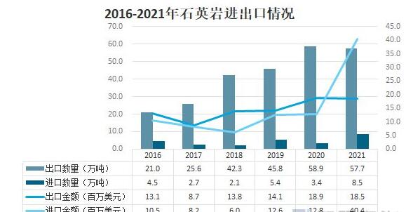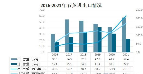 我國(guó)石英出口量較大,進(jìn)出口量差距逐步拉大。2021年,我國(guó)出口石英57.4萬(wàn)噸,較2020年增加38%,出口金額為216.3百萬(wàn)美元,我國(guó)進(jìn)口石英22.2萬(wàn)噸,同比下降28%,進(jìn)口金額為172百萬(wàn)美元。