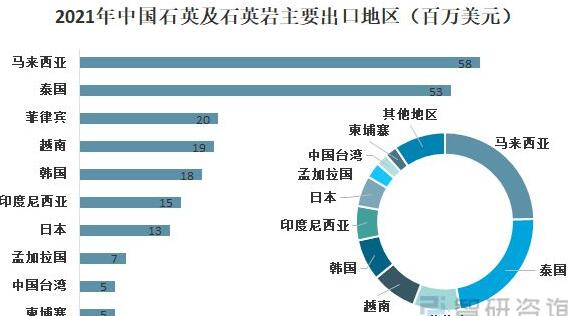 2021年我國(guó)石英及石英巖首要出口到了馬來(lái)亞、泰國(guó)、菲律賓、越南等周邊國(guó)家,其間馬來(lái)西亞和泰國(guó)的出口金額分別為58百萬(wàn)美元和53百萬(wàn)美元,占我國(guó)2021年石英及石英巖出口總額的24.5%和22.8%。